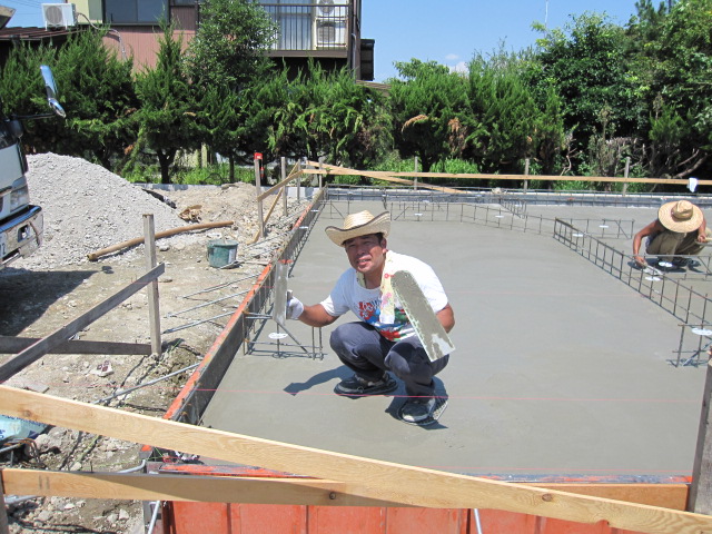 お盆休み前に、鉄筋工事は完了させて、休み明けに、10年保証の鉄筋検査を受けました、指摘事項はなく、1パツ合格でした。その後、猛暑の中ベースコンクリートを打設しました。