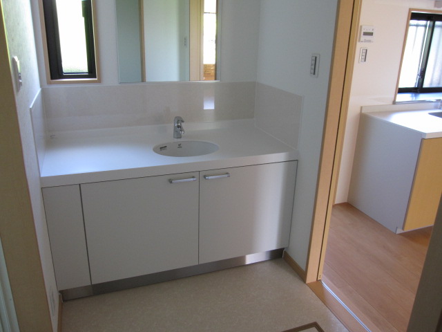最初は、おしゃれな洗面化粧台でしたが、戸手が無く後付け!水が飛び散るので、キッチン用のパネルを後で貼って頂きました!! 使い勝手重視です!でもやぱりカッコ悪いね!!