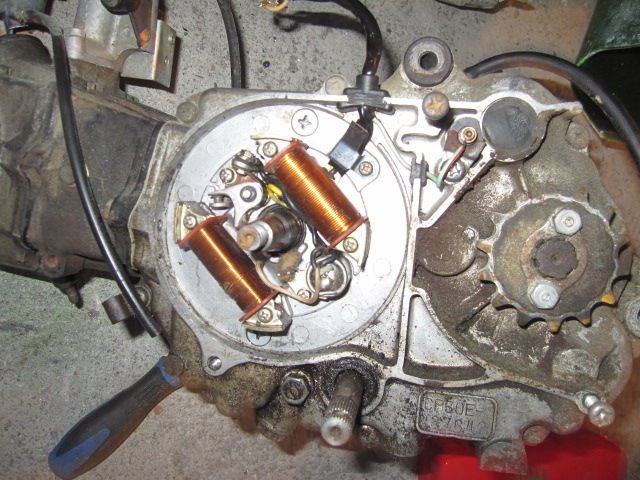 6Vのエンジンは点火が、ポイントしきらしいので、ポイントの接合面を見てみると錆び錆び!!掃除してグリス塗ってキック!!点火した!!ヤッタ~!!エンジンもかかりました! セッティングはまだだけど!でも進歩だ~!