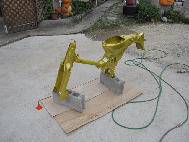 今回始めてのキャンディー塗装に挑戦です!キャンディー下地はゴールドフレークでいくので!最初にゴールドメタリックを塗装しました!