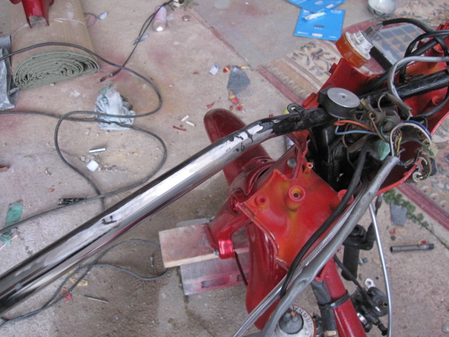 問題発生!左側のハンドルはクラッチレバーを取り付けなくては!ハンドルの長さが足りない!その前にカブのハンドルは細すぎて、クラッチレバー グリップ アクセルスロットル社外品が全て付かない!こまった!!しょうがない!ハンドル切断して、中に鉄棒つっこんで溶接で普通サイズのハンドル切断して溶接!問題解決! バイクカスタム手ごわし!!